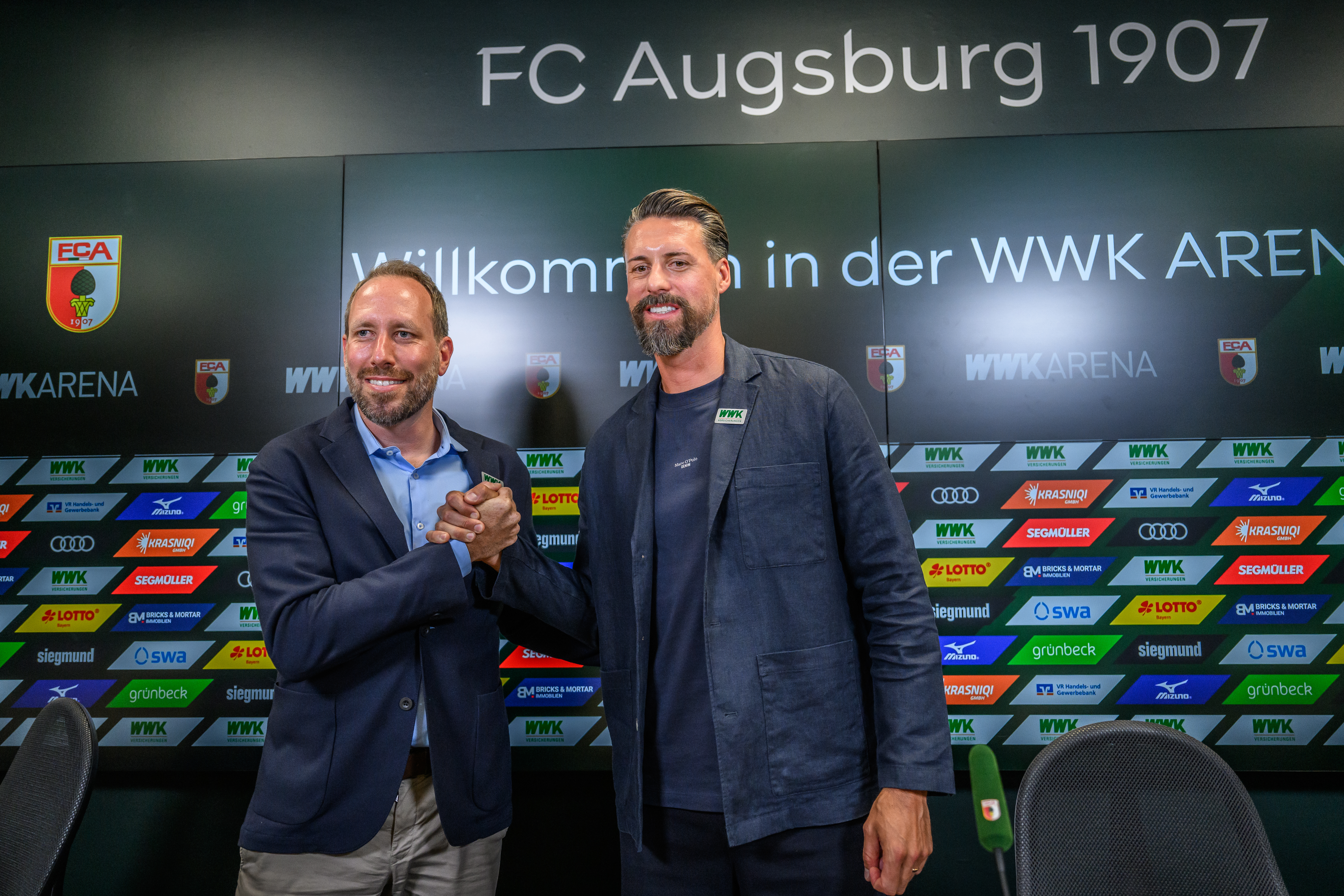 AUGSBURG, GERMANY – JULY 07: Michael Stroell, Managing director of FC Augsburg and Sandro Wagner, Head coach of FC Augsburg (R) shake hands during the presentation of Sandro Wagner as new head coach of FC Augsburg at the press conference at WWK Arena on July 07, 2025 in Augsburg, Germany. (Photo by Christian Kaspar-Bartke/Getty Images)