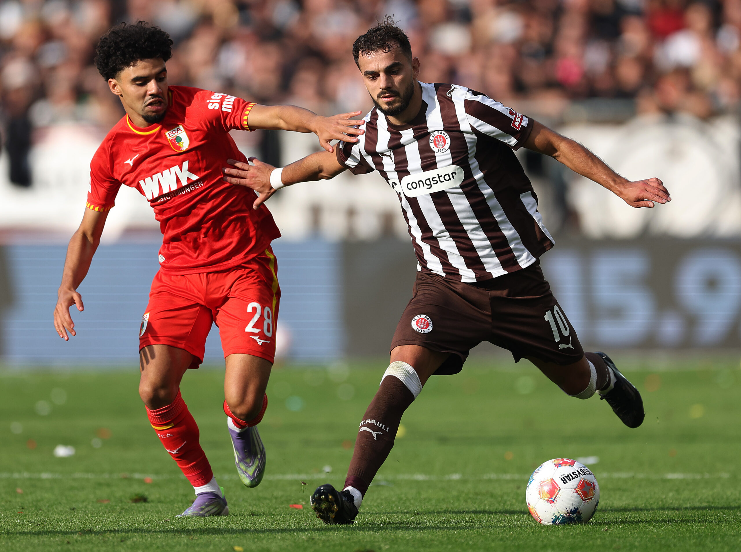HAMBURG, GERMANY – SEPTEMBER 14: Aiman Dardari of Augsburg is challenged Danel Sinani of St Pauli during the Bundesliga match between FC St. Pauli and FC Augsburg at Millerntor Stadium on September 14, 2025 in Hamburg, Germany. (Photo by Stuart Franklin/Getty Images)