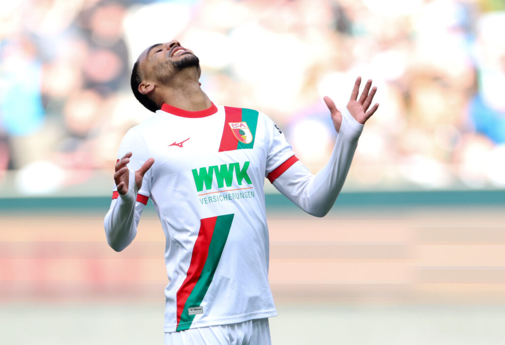 AUGSBURG, GERMANY – OCTOBER 25: Alexis Claude-Maurice of Augsburg reacts after a missed chance during the Bundesliga match between FC Augsburg and RB Leipzig at WWK-Arena on October 25, 2025 in Augsburg, Germany. (Photo by Adam Pretty/Getty Images)